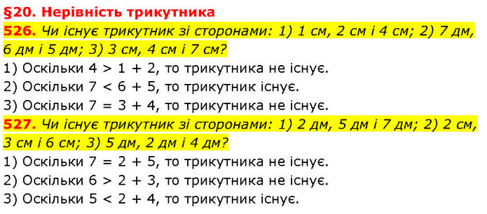 §20. Нерівність трикутника 526. Чи існує трикутник зі сторонами: 1) 1 см, 2 см і 4 см; 2) 7 дм, 6 дм і 5 дм; 3) 3 см, 4 см і 7 см? 1) Оскільки 4 > 1 + 2, то трикутника не існує. 2) Оскільки 7 < 6 + 5, то трикутник існує. 3) Оскільки 7 = 3 + 4, то трикутника не існує. 527. Чи існує трикутник зі сторонами: 1) 2 дм, 5 дм і 7 дм; 2) 2 см, 3 см і 6 см; 3) 5 дм, 2 дм і 4 дм? 1) Оскільки 7 = 2 + 5, то трикутника не існує. 2) Оскільки 6 > 2 + 3, то трикутника не існує. 3) Оскільки 5 < 2 + 4, то трикутник існує.