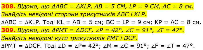 308. Відомо, що ΔABC = ΔKLP, AB = 5 CM, LP = 9 CM, AC = 8 см. Знайдіть невідомі сторони трикутників ABC і KLP. ∆ABC = ∆KLP. Тоді KL = AB = 5 см; BC = LP = 9 см; KP = AC = 8 см. 309. Відомо, що ΔPMT = ΔDCF, ∠P = 42°, ∠C = 91°, ∠T = 47°. Знайдіть невідомі кути трикутників PMT і DCF. ∆PMT = ∆DCF. Тоді ∠D = ∠P= 42°; ∠M = ∠C = 91°; ∠F = ∠T = 47°.