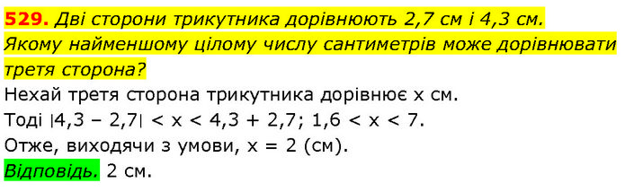 Дві сторони трикутника дорівнюють 2,7 см і 4,3 см. Якому найменшому цілому числу сантиметрів може дорівнювати третя сторона? Нехай третя сторона трикутника дорівнює х см. Тоді ∣4,3 – 2,7∣ < x < 4,3 + 2,7; 1,6 < x < 7. Отже, виходячи з умови, х = 2 (см). Відповідь. 2 см.