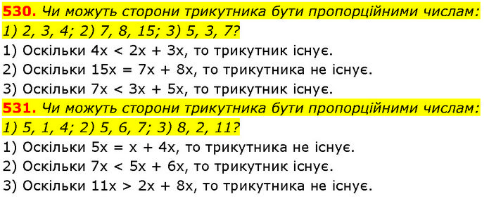 530. Чи можуть сторони трикутника бути пропорційними числам: 1) 2, 3, 4; 2) 7, 8, 15; 3) 5, 3, 7? 1) Оскільки 4х < 2х + Зх, то трикутник існує. 2) Оскільки 15x = 7х + 8х, то трикутника не існує. 3) Оскільки 7х < Зх + 5х, то трикутник існує. 531. Чи можуть сторони трикутника бути пропорційними числам: 1) 5, 1, 4; 2) 5, 6, 7; 3) 8, 2, 11? 1) Оскільки 5х = х + 4х, то трикутника не існує. 2) Оскільки 7x < 5х + 6х, то трикутник існує. 3) Оскільки 11x > 2х + 8х, то трикутника не існує.