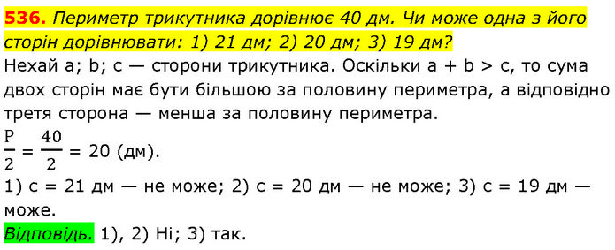 Периметр трикутника дорівнює 40 дм. Чи може одна з його сторін дорівнювати: 1) 21 дм; 2) 20 дм; 3) 19 дм? Нехай а; b; с — сторони трикутника. Оскільки a + b > с, то сума двох сторін має бути більшою за половину периметра, а відповідно третя сторона — менша за половину периметра. Р/2 = 40/2 = 20 (дм). 1) с = 21 дм — не може; 2) с = 20 дм — не може; 3) с = 19 дм — може. Відповідь. 1), 2) Ні; 3) так.
