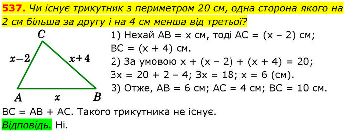 Чи існує трикутник з периметром 20 см, одна сторона якого на 2 см більша за другу і на 4 см менша від третьої? 1) Нехай AB = х см, тоді AC = (х – 2) см; BC = (х + 4) см. 2) За умовою х + (х – 2) + (х + 4) = 20; Зх = 20 + 2 – 4; Зх = 18; х = 6 (см). 3) Отже, AB = 6 см; AC = 4 см; BC = 10 см. BC = AB + АС. Такого трикутника не існує. Відповідь. Ні.