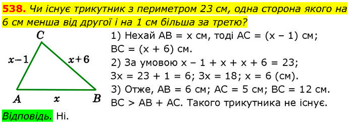 Чи існує трикутник з периметром 23 см, одна сторона якого на 6 см менша від другої і на 1 см більша за третю? 1) Нехай AB = х см, тоді AC = (х – 1) см; BC = (х + 6) см. 2) Зa умовою х – 1 + х + х + 6 = 23; Зх = 23 + 1 = 6; Зх = 18; х = 6 (см). 3) Отже, AB = 6 см; AC = 5 см; BC = 12 см. BC > AB + АС. Такого трикутника не існує. Відповідь. Ні.