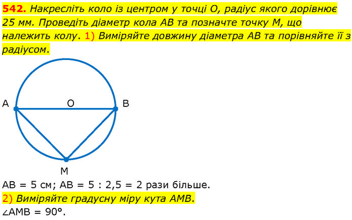 Накресліть коло із центром у точці О, радіус якого дорівнює 25 мм. Проведіть діаметр кола AB та позначте точку М, що належить колу. 1) Виміряйте довжину діаметра AB та порівняйте її з радіусом. АВ = 5 см; АВ = 5 : 2,5 = 2 рази більше. 2) Виміряйте градусну міру кута АМВ. ∠AМВ = 90°.