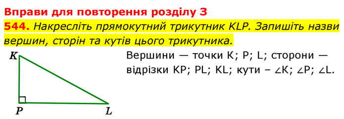 Вправи для повторення розділу З 544. Накресліть прямокутний трикутник KLP. Запишіть назви вершин, сторін та кутів цього трикутника. Вершини — точки К; Р; L; сторони — відрізки KP; PL; KL; кути – ∠К; ∠P; ∠L.