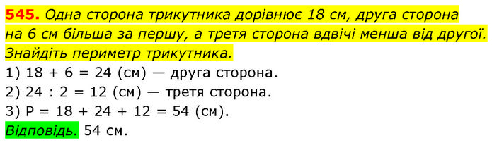 545. Одна сторона трикутника дорівнює 18 см, друга сторона на 6 см більша за першу, а третя сторона вдвічі менша від другої. Знайдіть периметр трикутника. 1) 18 + 6 = 24 (см) — друга сторона. 2) 24 : 2 = 12 (см) — третя сторона. 3) P = 18 + 24 + 12 = 54 (см). Відповідь. 54 см.