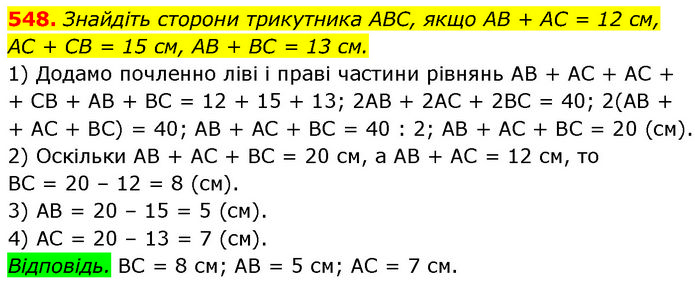Знайдіть сторони трикутника ABC, якщо AB + AC = 12 см, AC + CB = 15 см, AB + BC = 13 см. 1) Додамо почленно ліві і праві частини рівнянь AB + AC + AC + + CB + AB + BC = 12 + 15 + 13; 2AB + 2AC + 2ВС = 40; 2(AB + + AC + BC) = 40; AB + AC + BC = 40 : 2; AB + AC + BC = 20 (см). 2) Оскільки AB + AC + BC = 20 см, a AB + AC = 12 см, то BC = 20 – 12 = 8 (см). 3) AB = 20 – 15 = 5 (см). 4) AC = 20 – 13 = 7 (см). Відповідь. BC = 8 см; AB = 5 см; AC = 7 см.