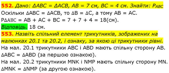552. Дано: ΔABC = ΔACB, AB = 7 см, BC = 4 см. Знайти: PABC Оскільки ∆ABC = ∆ACB, то ∆B = ∆C, а тому AB = АС. P∆АВС = AB + AC + BC = 7 + 7 + 4 = 18(см). Відповідь. 18 см. 553. Назвіть спільний елемент трикутників, зображених на малюнках 20.1 та 20.2, і ознаку, за якою ці трикутники рівні. На мал. 20.1 трикутники ABC і ABD мають спільну сторону AB. ∆ABC = ∆ABD (за першою ознакою). На мал. 20.2 трикутники MNK і NMP мають спільну сторону MN. ∆MNK = ∆NMP (за другою ознакою).