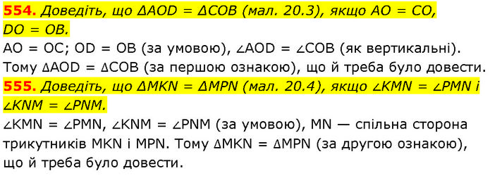 554. Доведіть, що ΔAOD = ΔCOB (мал. 20.3), якщо AO = CО, DO = OB. AO = ОС; OD = OB (за умовою), ∠AOD = ∠COB (як вертикальні). Тому ∆AOD = ∆COB (за першою ознакою), що й треба було довести. 555. Доведіть, що ΔMKN = ΔMPN (мал. 20.4), якщо ∠KMN = ∠PMN і ∠KNM = ∠PNM. ∠KMN = ∠PMN, ∠KNM = ∠PNM (за умовою), MN — спільна сторона трикутників MKN і MPN. Тому ∆MKN = ∆MPN (за другою ознакою), що й треба було довести.