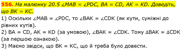На малюнку 20.5 ∠МАВ = ∠РDС, ВА = CD, AK = KD. Доведіть, що BK = KC. 1) Оскільки ∠MAB = ∠PDC, то ∠BAK = ∠CDK (як кути, суміжні до рівних кутів). 2) BA = CD, AK = KD (за умовою), ∠BAK = ∠CDK. Тому ∆BAK = ∆CDK (за першою ознакою). 3) Маємо звідси, що BK = KC, що й треба було довести.