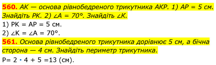560. AK — основа рівнобедреного трикутника АКР. 1) AP = 5 см. Знайдіть PK. 2) ∠A = 70°. Знайдіть ∠К. 1) PK = AP = 5 см. 2) ∠K = ∠A = 70°. 561. Основа рівнобедреного трикутника дорівнює 5 см, а бічна сторона — 4 см. Знайдіть периметр трикутника. P= 2 ∙ 4 + 5 =13 (см).
