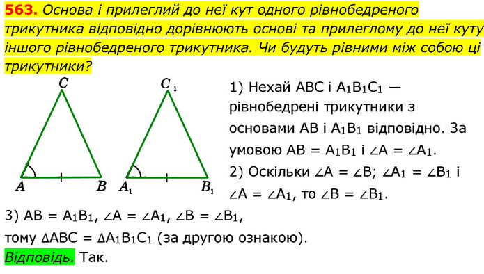 Основа і прилеглий до неї кут одного рівнобедреного трикутника відповідно дорівнюють основі та прилеглому до неї куту іншого рівнобедреного трикутника. Чи будуть рівними між собою ці трикутники? 1) Нехай ABC і A1B1C1 — рівнобедрені трикутники з основами AB і A1B1 відповідно. За умовою AB = A1B1 і ∠A = ∠A1. 2) Оскільки ∠A = ∠B; ∠A1 = ∠B1 і ∠A = ∠A1, то ∠B = ∠B1. 3) AB = A1B1, ∠A = ∠A1, ∠B = ∠B1, тому ∆ABC = ∆A1B1C1 (за другою ознакою). Відповідь. Так.