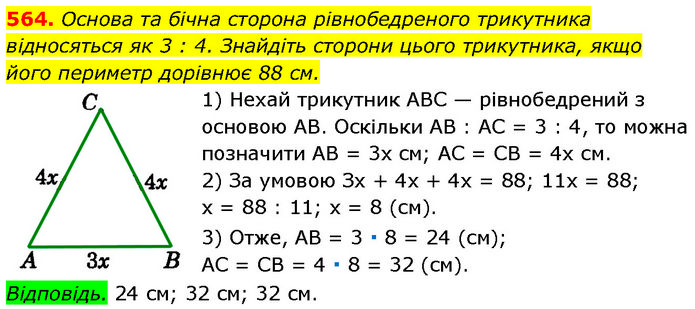 Основа та бічна сторона рівнобедреного трикутника відносяться як 3 : 4. Знайдіть сторони цього трикутника, якщо його периметр дорівнює 88 см. 1) Нехай трикутник ABC — рівнобедрений з основою AB. Оскільки AB : AC = 3 : 4, то можна позначити AB = 3x см; AC = CB = 4х см. 2) За умовою Зх + 4х + 4х = 88; 11x = 88; х = 88 : 11; х = 8 (см). 3) Отже, AB = 3 ∙ 8 = 24 (см); AC = CB = 4 ∙ 8 = 32 (см). Відповідь. 24 см; 32 см; 32 см.