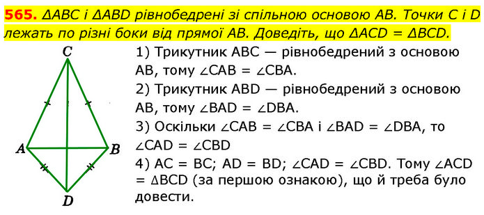 ΔABC і ΔABD рівнобедрені зі спільною основою AB. Точки C і D лежать по різні боки від прямої AB. Доведіть, що ΔACD = ΔBCD. 1) Трикутник ABC — рівнобедрений з основою AB, тому ∠CAB = ∠CBA. 2) Трикутник ABD — рівнобедрений з основою AB, тому ∠BAD = ∠DBA. 3) Оскільки ∠CAB = ∠CBA і ∠BAD = ∠DBA, то ∠CAD = ∠CBD 4) AC = BC; AD = BD; ∠CAD = ∠CBD. Тому ∠ACD = ∆BCD (за першою ознакою), що й треба було довести.