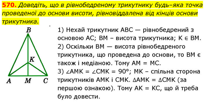 Доведіть, що в рівнобедреному трикутнику будь–яка точка проведеної до основи висоти, рівновіддалена від кінців основи трикутника. 1) Нехай трикутник ABC — рівнобедрений з основою AC; BM – висота трикутника; K ∈ BM. 2) Оскільки BM — висота рівнобедреного трикутника, що проведена до основи, то BM є також і медіаною. Тому AM = MC. 3) ∠AMK = ∠CMK = 90°; MK – спільна сторона трикутників AMK і CMK. ∆AMK = ∆CMK (за першою ознакою). Тому AK = KC, що й треба було довести.