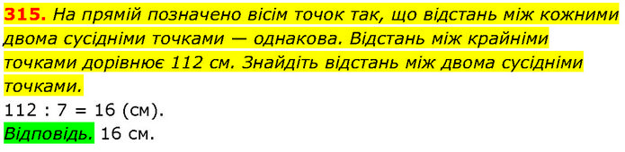 На прямій позначено вісім точок так, що відстань між кожними двома сусідніми точками — однакова. Відстань між крайніми точками дорівнює 112 см. Знайдіть відстань між двома сусідніми точками. 112 : 7 = 16 (см). Відповідь. 16 см.