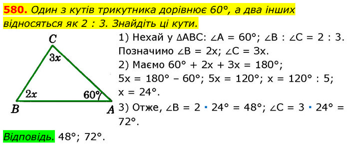 Один з кутів трикутника дорівнює 60°, а два інших відносяться як 2 : 3. Знайдіть ці кути. 1) Нехай у ∆АBC: ∠A = 60°; ∠B : ∠C = 2 : 3. Позначимо ∠B = 2х; ∠C = Зх. 2) Маємо 60° + 2х + Зх = 180°; 5х = 180° – 60°; 5х = 120°; х = 120° : 5; х = 24°. 3) Отже, ∠B = 2 ∙ 24° = 48°; ∠C = 3 ∙ 24° = 72°. Відповідь. 48°; 72°.