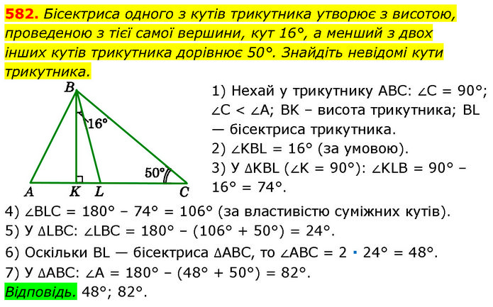 Бісектриса одного з кутів трикутника утворює з висотою, проведеною з тієї самої вершини, кут 16°, а менший з двох інших кутів трикутника дорівнює 50°. Знайдіть невідомі кути трикутника. 1) Нехай у трикутнику ABC: ∠C = 90°; ∠C < ∠A; BK – висота трикутника; BL — бісектриса трикутника. 2) ∠KBL = 16° (за умовою). 3) У ∆KBL (∠K = 90°): ∠KLB = 90° – 16° = 74°. 4) ∠BLC = 180° – 74° = 106° (за властивістю суміжних кутів). 5) У ∆LBC: ∠LBC = 180° – (106° + 50°) = 24°. 6) Оскільки BL — бісектриса ∆ABC, то ∠ABC = 2 ∙ 24° = 48°. 7) У ∆ABC: ∠A = 180° – (48° + 50°) = 82°. Відповідь. 48°; 82°.