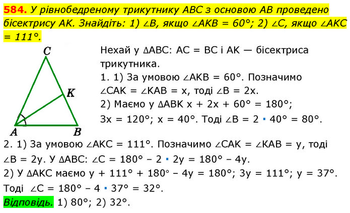 У рівнобедреному трикутнику ABC з основою AB проведено бісектрису AK. Знайдіть: 1) ∠В, якщо ∠AKB = 60°; 2) ∠С, якщо ∠AKC = 111°. Нехай у ∆ABC: AC = BC і AK — бісектриса трикутника. 1. 1) За умовою ∠AKB = 60°. Позначимо ∠CAK = ∠KAB = х, тоді ∠B = 2х. 2) Маємо у ∆ABK х + 2х + 60° = 180°; Зх = 120°; х = 40°. Тоді ∠B = 2 ∙ 40° = 80°. 2. 1) За умовою ∠AKC = 111°. Позначимо ∠CAK = ∠КАВ = у, тоді ∠В = 2у. У ∆АВС: ∠С = 180° – 2 ∙ 2у = 180° – 4у. 2) У ∆AKC маємо у + 111° + 180° – 4у = 180°; 3у = 111°; у = 37°. Тоді ∠C = 180° – 4 ∙ 37° = 32°. Відповідь. 1) 80°; 2) 32°.