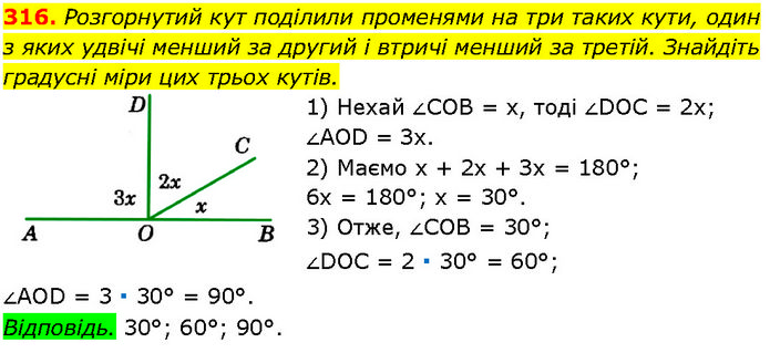 Розгорнутий кут поділили променями на три таких кути, один з яких удвічі менший за другий і втричі менший за третій. Знайдіть градусні міри цих трьох кутів. 1) Нехай ∠COB = х, тоді ∠DOC = 2х; ∠AOD = Зх. 2) Маємо х + 2х + Зх = 180°; 6х = 180°; х = 30°. 3) Отже, ∠COB = 30°; ∠DOC = 2 ∙ 30° = 60°; ∠AOD = 3 ∙ 30° = 90°. Відповідь. 30°; 60°; 90°.