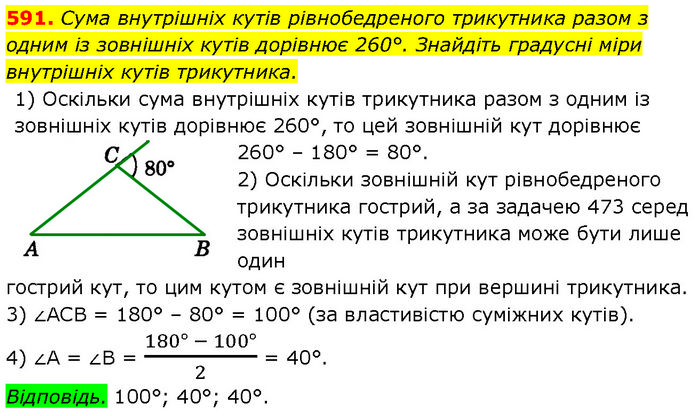 Сума внутрішніх кутів рівнобедреного трикутника разом з одним із зовнішніх кутів дорівнює 260°. Знайдіть градусні міри внутрішніх кутів трикутника. 1) Оскільки сума внутрішніх кутів трикутника разом з одним із зовнішніх кутів дорівнює 260°, то цей зовнішній кут дорівнює 260° – 180° = 80°. 2) Оскільки зовнішній кут рівнобедреного трикутника гострий, а за задачею 473 серед зовнішніх кутів трикутника може бути лише один гострий кут, то цим кутом є зовнішній кут при вершині трикутника. 3) ∠АСВ = 180° – 80° = 100° (за властивістю суміжних кутів). 4) ∠А = ∠В = (180° - 100°)/2 = 40°. Відповідь. 100°; 40°; 40°.