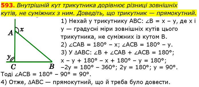 Внутрішній кут трикутника дорівнює різниці зовнішніх кутів, не суміжних з ним. Доведіть, що трикутник — прямокутний. 1) Нехай у трикутнику ABC: ∠B = х – у, де х і у — градусні міри зовнішніх кутів цього трикутника, не суміжних із кутом В. 2) ∠CAB = 180° – х; ∠ACB = 180° – у. 3) У ∆ABC: ∠B + ∠CAB + ∠ACB = 180°; х – у + 180° – х + 180° – у = 180°; –2у = 180° – 360°; 2у = 180°; у = 90°. Тоді ∠ACB = 180° – 90° = 90°. 4) Отже, ∆ABC — прямокутний, що й треба було довести.