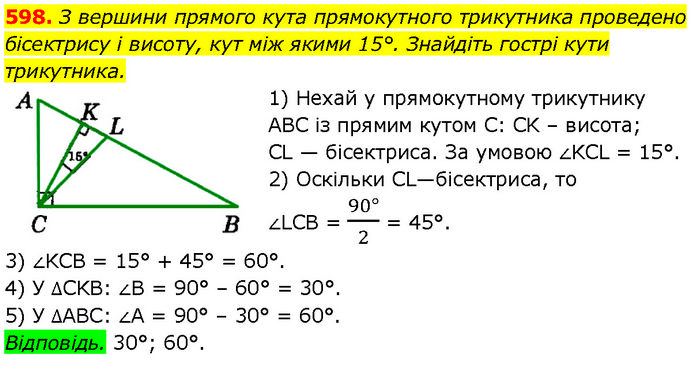 З вершини прямого кута прямокутного трикутника проведено бісектрису і висоту, кут між якими 15°. Знайдіть гострі кути трикутника. 1) Нехай у прямокутному трикутнику ABC із прямим кутом С: CK – висота; CL — бісектриса. За умовою ∠KCL = 15°. 2) Оскільки CL—бісектриса, то ∠LCB = (90°)/2 = 45°. 3) ∠KCB = 15° + 45° = 60°. 4) У ∆CKB: ∠B = 90° – 60° = 30°. 5) У ∆ABC: ∠A = 90° – 30° = 60°. Відповідь. 30°; 60°.