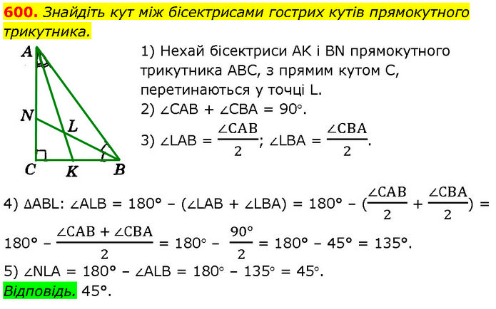 Знайдіть кут між бісектрисами гострих кутів прямокутного трикутника. 1) Нехай бісектриси AK і BN прямокутного трикутника ABC, з прямим кутом С, перетинаються у точці L. 2) ∠САВ + ∠СВА = 90°. 3) ∠LAB = (∠CAB)/2; ∠LBA = (∠CBA)/2. 4) ∆ABL: ∠ALB = 180° – (∠LAB + ∠LBA) = 180° – ((∠СAB)/2 + (∠СBA)/2) = 180° – (∠СAB + ∠СBA)/2 = 180° – (90°)/2 = 180° – 45° = 135°. 5) ∠NLA = 180° – ∠ALB = 180° – 135° = 45°. Відповідь. 45°.