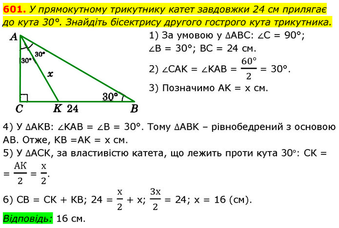 У прямокутному трикутнику катет завдовжки 24 см прилягає до кута 30°. Знайдіть бісектрису другого гострого кута трикутника. 1) За умовою у ∆ABC: ∠C = 90°; ∠B = 30°; BC = 24 см. 2) ∠CAK = ∠KAB = (60°)/2 = 30°. 3) Позначимо AK = х см. 4) У ∆AKB: ∠KAB = ∠B = 30°. Тому ∆ABK – рівнобедрений з основою AB. Отже, KB =AK = х см. 5) У ∆АСК, за властивістю катета, що лежить проти кута 30°: СК = = АК/2 = х/2. 6) СВ = СК + КВ; 24 = х/2 + х; 3х/2 = 24; х = 16 (см). Відповідь: 16 см.