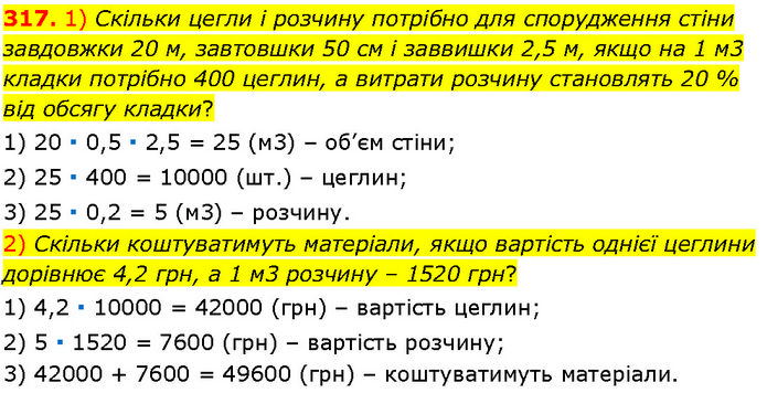 1) Скільки цегли і розчину потрібно для спорудження стіни завдовжки 20 м, завтовшки 50 см і заввишки 2,5 м, якщо на 1 м3 кладки потрібно 400 цеглин, а витрати розчину становлять 20 % від обсягу кладки? 1) 20 ∙ 0,5 ∙ 2,5 = 25 (м3) – об’єм стіни; 2) 25 ∙ 400 = 10000 (шт.) – цеглин; 3) 25 ∙ 0,2 = 5 (м3) – розчину. 2) Скільки коштуватимуть матеріали, якщо вартість однієї цеглини дорівнює 4,2 грн, а 1 м3 розчину – 1520 грн? 1) 4,2 ∙ 10000 = 42000 (грн) – вартість цеглин; 2) 5 ∙ 1520 = 7600 (грн) – вартість розчину; 3) 42000 + 7600 = 49600 (грн) – коштуватимуть матеріали.
