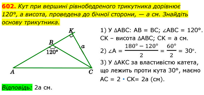 Кут при вершині рівнобедреного трикутника дорівнює 120°, а висота, проведена до бічної сторони, — а см. Знайдіть основу трикутника. 1) У ∆ABC: AB = BC; ∠ABC = 120°. CK – висота ∆ABC; CK = а см. 2) ∠А = (180° - 120°)/2 = (60°)/2 = 30°. 3) У ∆AKC за властивістю катета, що лежить проти кута 30°, маємо AC = 2 ∙ CK= 2а (см). Відповідь: 2а см.