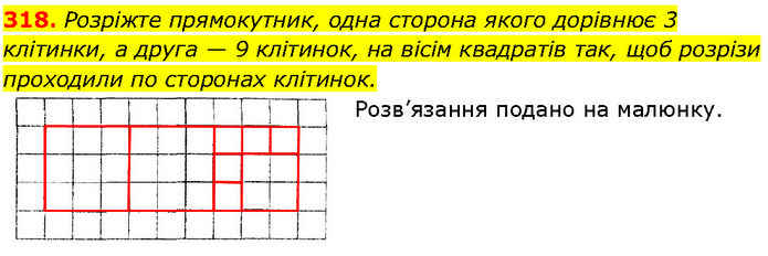 Розріжте прямокутник, одна сторона якого дорівнює 3 клітинки, а друга — 9 клітинок, на вісім квадратів так, щоб розрізи проходили по сторонах клітинок. Розв’язання подано на малюнку.