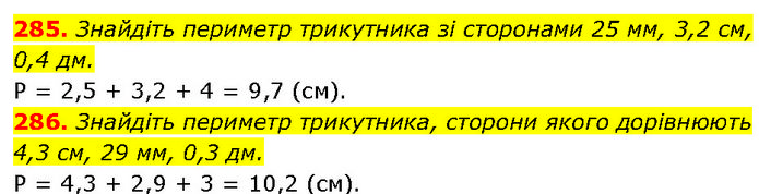 285. Знайдіть периметр трикутника зі сторонами 25 мм, 3,2 см, 0,4 дм. P = 2,5 + 3,2 + 4 = 9,7 (см). 286. Знайдіть периметр трикутника, сторони якого дорівнюють 4,3 см, 29 мм, 0,3 дм. P = 4,3 + 2,9 + 3 = 10,2 (см).