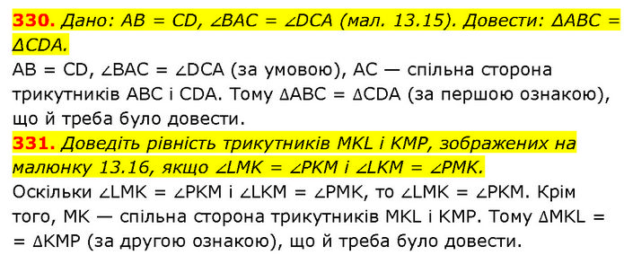 330. Дано: AB = CD, ∠ВАС = ∠DCA (мал. 13.15). Довести: ΔABC = ΔCDA. AB = CD, ∠BAC = ∠DCA (за умовою), AC — спільна сторона трикутників ABC і CDA. Тому ∆ABC = ∆CDA (за першою ознакою), що й треба було довести. 331. Доведіть рівність трикутників MKL і KMP, зображених на малюнку 13.16, якщо ∠LMK = ∠PKM і ∠LKM = ∠PMK. Оскільки ∠LMK = ∠PKM і ∠LKM = ∠PMK, то ∠LMK = ∠PKM. Крім того, MK — спільна сторона трикутників MKL і KMP. Тому ∆MKL = = ∆KMP (за другою ознакою), що й треба було довести.
