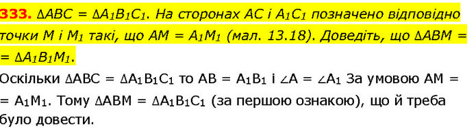 ∆ABC = ∆A1B1C1. На сторонах AC і A1C1 позначено відповідно точки M і M1 такі, що AM = A1M1 (мал. 13.18). Доведіть, що ∆ABM = = ∆A1B1M1. Оскільки ∆ABC = ∆A1B1C1 то AB = A1B1 і ∠A = ∠A1 За умовою AM = = A1M1. Тому ∆ABM = ∆A1B1C1 (за першою ознакою), що й треба було довести.