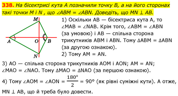 На бісектрисі кута А позначили точку В, а на його сторонах такі точки M і N , що ∠ABM = ∠ABN. Доведіть, що MN ⊥ AB. 1) Оскільки AB — бісектриса кута А, то ∠MAB = ∠NAB. Крім того, ∠ABM = ∠ABN (за умовою) і AB — спільна сторона трикутників ABM і ABN. Тому ∆ABM = ∆ABN (за другою ознакою). 2) Тому AM = AN. 3) AO — спільна сторона трикутників AOM і AON; AM = AN; ∠MAO = ∠NAO. Тому ∆MAO = ∆NAO (за першою ознакою). 4) Тому ∠AOM = ∠AON = (180°)/2 = 90° (як рівні суміжні кути). А отже, MN ⊥ AB, що й треба було довести.
