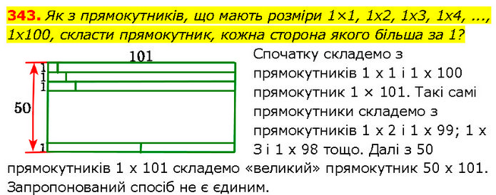 Як з прямокутників, що мають розміри 1×1, 1x2, 1x3, 1x4, ..., 1x100, скласти прямокутник, кожна сторона якого більша за 1? Спочатку складемо з прямокутників 1 x 1 i 1 x 100 прямокутник 1 × 101. Такі самі прямокутники складемо з прямокутників 1 х 2 і 1 х 99; 1 х З і 1 х 98 тощо. Далі з 50 прямокутників 1 х 101 складемо «великий» прямокутник 50 х 101. Запропонований спосіб не є єдиним.