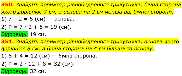 350. Знайдіть периметр рівнобедреного трикутника, бічна сторона якого дорівнює 7 см, а основа на 2 см менша від бічної сторони. 1) 7 – 2 = 5 (см) — основа. 2) P = 7 ∙ 2 + 5 = 19 (cм). Відповідь. 19 см. 351. Знайдіть периметр рівнобедреного трикутника, основа якого дорівнює 8 см, а бічна сторона на 4 см більша за основу. 1) 8 + 4 = 12 (см) — бічна сторона. 2) P = 2 ∙ 12 + 8 = 32 (см). Відповідь. 32 см.