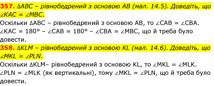 357. ∆АВС – рівнобедрений з основою АВ (мал. 14.5). Доведіть, що ∠КАС = ∠МВС. Оскільки ∆ABC – рівнобедрений з основою AB, то ∠CAB = ∠CBA. ∠KAC = 180° – ∠CAB = 180° – ∠CBA = ∠MBC, що й треба було довести. 358. ∆KLM – рівнобедрений з основою KL (мал. 14.6). Доведіть, що ∠MKL = ∠PLN. Оскільки ∆KLM– рівнобедрений з основою KL, то ∠MKL = ∠MLK. ∠PLN = ∠MLK (як вертикальні), тому ∠MKL = ∠PLN, що й треба було довести.
