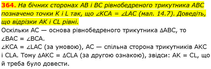 На бічних сторонах AB і BC рівнобедреного трикутника ABC позначено точки K і L так, що ∠KCA = ∠LAC (мал. 14.7). Доведіть, що відрізки AK і CL рівні. Оскільки AC — основа рівнобедреного трикутника ∆ABC, то ∠BAC = ∠BCA. ∠KCA = ∠LAC (за умовою), AC — спільна сторона трикутників AKC і CLA. Тому ∆AKC = ∆CLA (за другою ознакою), звідси: AK = CL, що й треба було довести.