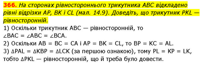 На сторонах рівностороннього трикутника ABC відкладено рівні відрізки АР, BK і CL (мал. 14.9). Доведіть, що трикутник PKL — рівносторонній. 1) Оскільки трикутник ABC — рівносторонній, то ∠BAC = ∠ABC = ∠BCA. 2) Оскільки AB = BC = CA i AP = BK = CL, то BP = KC = AL. 3) ∆PAL = ∆KBP = ∆LCK (за першою ознакою), тому PL = KP = LK, тобто ∆PKL — рівносторонній, що й треба було довести.
