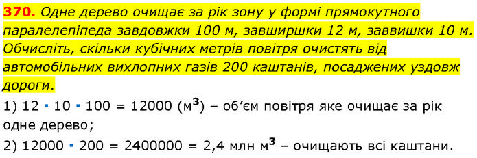 Одне дерево очищає за рік зону у формі прямокутного паралелепіпеда завдовжки 100 м, завширшки 12 м, заввишки 10 м. Обчисліть, скільки кубічних метрів повітря очистять від автомобільних вихлопних газів 200 каштанів, посаджених уздовж дороги. 1) 12 ∙ 10 ∙ 100 = 12000 (м3) – об’єм повітря яке очищає за рік одне дерево; 2) 12000 ∙ 200 = 2400000 = 2,4 млн м3 – очищають всі каштани.