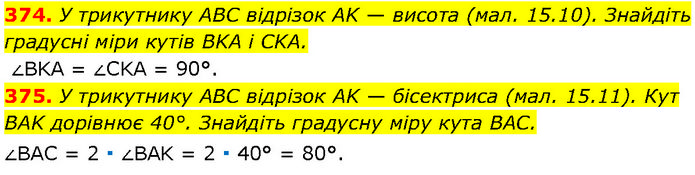 374. У трикутнику ABC відрізок AK — висота (мал. 15.10). Знайдіть градусні міри кутів BKA і CKA. ∠BKA = ∠CKA = 90°. 375. У трикутнику ABC відрізок AK — бісектриса (мал. 15.11). Кут BAK дорівнює 40°. Знайдіть градусну міру кута ВАС. ∠BAC = 2 ∙ ∠BAK = 2 ∙ 40° = 80°.