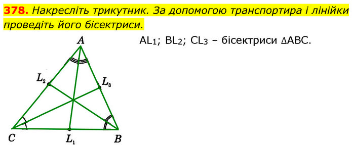 Накресліть трикутник. За допомогою транспортира і лінійки проведіть його бісектриси. AL1; BL2; CL3 – бісектриси ∆ABC.