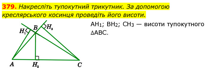 Накресліть тупокутний трикутник. За допомогою креслярського косинця проведіть його висоти. AН1; BН2; CH3 — висоти тупокутного ∆ABC.