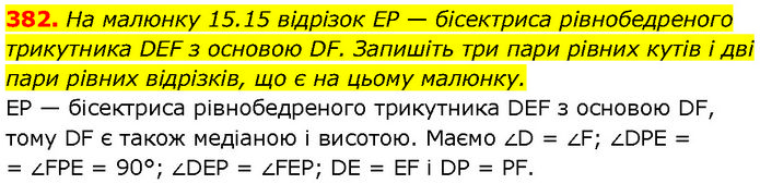 На малюнку 15.15 відрізок EP — бісектриса рівнобедреного трикутника DEF з основою DF. Запишіть три пари рівних кутів і дві пари рівних відрізків, що є на цьому малюнку. EP — бісектриса рівнобедреного трикутника DEF з основою DF, тому DF є також медіаною і висотою. Маємо ∠D = ∠F; ∠DPE = = ∠FPE = 90°; ∠DEP = ∠FEP; DE = EF і DP = PF.