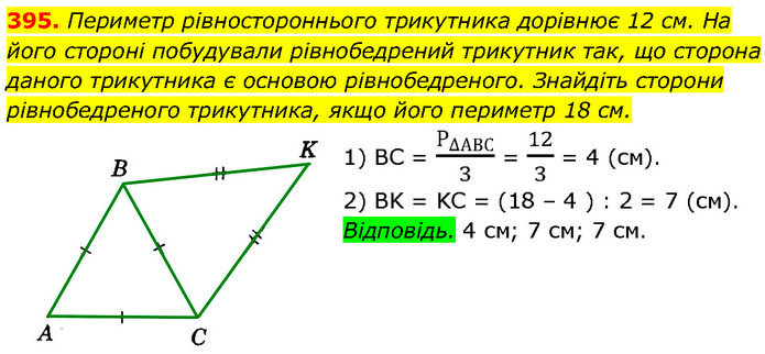Периметр рівностороннього трикутника дорівнює 12 см. На його стороні побудували рівнобедрений трикутник так, що сторона даного трикутника є основою рівнобедреного. Знайдіть сторони рівнобедреного трикутника, якщо його периметр 18 см. 1) BC = Р_∆АВС/3 = 12/3 = 4 (см). 2) BK = KC = (18 – 4 ) : 2 = 7 (см). Відповідь. 4 см; 7 см; 7 см.