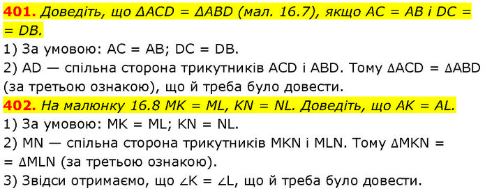 401. Доведіть, що ΔACD = ΔABD (мал. 16.7), якщо AC = AB і DC = = DB. 1) За умовою: AC = AB; DC = DB. 2) AD — спільна сторона трикутників ACD і ABD. Тому ∆ACD = ∆ABD (за третьою ознакою), що й треба було довести. 402. На малюнку 16.8 MK = ML, KN = NL. Доведіть, що AK = AL. 1) За умовою: MK = ML; KN = NL. 2) MN — спільна сторона трикутників MKN і MLN. Тому ∆MKN = = ∆MLN (за третьою ознакою). 3) Звідси отримаємо, що ∠K = ∠L, що й треба було довести.
