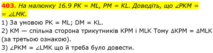 На малюнку 16.9 PK = ML, PM = KL. Доведіть, що ∠PKM = = ∠LMK. 1) За умовою PK = ML; DM = KL. 2) KM — спільна сторона трикутників KPM і MLK Тому ∆KPM = ∆MLK (за третьою ознакою). 3) ∠PKM = ∠LMK що й треба було довести.