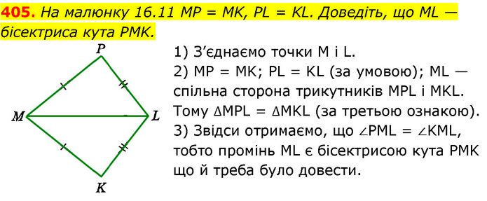 На малюнку 16.11 MP = MK, PL = KL. Доведіть, що ML — бісектриса кута PMK. 1) З’єднаємо точки M і L. 2) MP = MK; PL = KL (за умовою); ML — спільна сторона трикутників MPL і MKL. Тому ∆MPL = ∆MKL (за третьою ознакою). 3) Звідси отримаємо, що ∠PML = ∠KML, тобто промінь ML є бісектрисою кута PMK що й треба було довести.